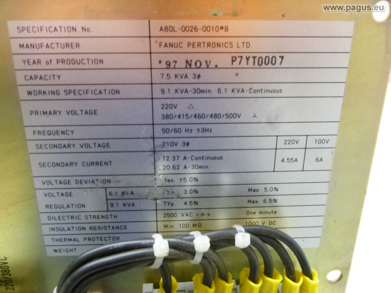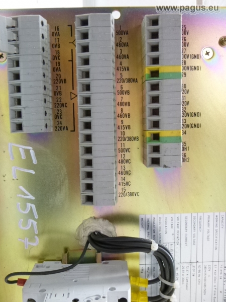 Primär: 380 V, 0,49 A / Sekundär: 220 V, 0,73 A